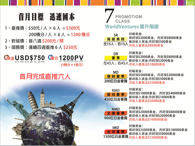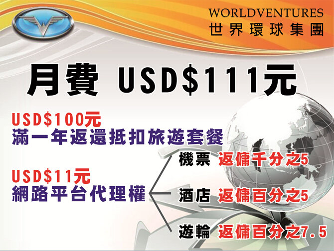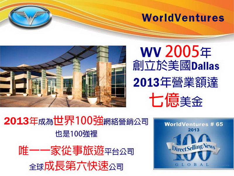 全名:worldventures 世界环旅集团,简称wv。是一个国际性的旅游在线平台,但wv的旅游和传统的旅游不一样,它采用的会员制,是全球最佳旅行俱乐部,世界100强直销公司排名第47位,连续5年获得旅游界的奥斯卡奖—麦哲伦奖,是目前全球旅游界的最高荣誉奖。简单说,会员可以用2/3星的价格买到4/5星的旅游套餐,它是一个可以让你旅游的同时又可能让你赚取额外收入的一个平台,因为它结合了全球排名第6的奖金制度,给每一位会员提供这样实现财富和时间自由的机遇。