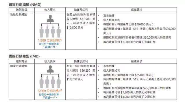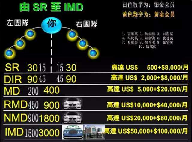 5、国家行销总监(NMD):左右市场达到:1800点(铂金900人),奖金封顶:周薪最高2万美金+被动收入最高2万美金+最高1000美金车补+旅游币,月薪最高约计:10万美金(人民币60万)