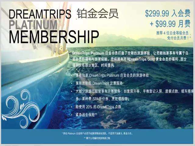 旅游积分 DreamTrips Points。与美金等值,通过自己加盟、推荐会员获得,可以用于购买旅游套餐抵扣套餐金额;