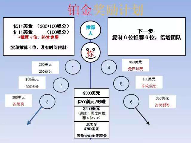 ★举例:你在任何连续28天期间之内,累积推荐了12位黄金或铂金会员,你就可以得到:100(首3位) + 150 (第4,5,6位) + 150 (第7,8,9位) + 150(第10,11,12位)=总奖金550美元+相应的积分。(如果推荐的是铂金会员同时获得直推50美元X12=600美元)。