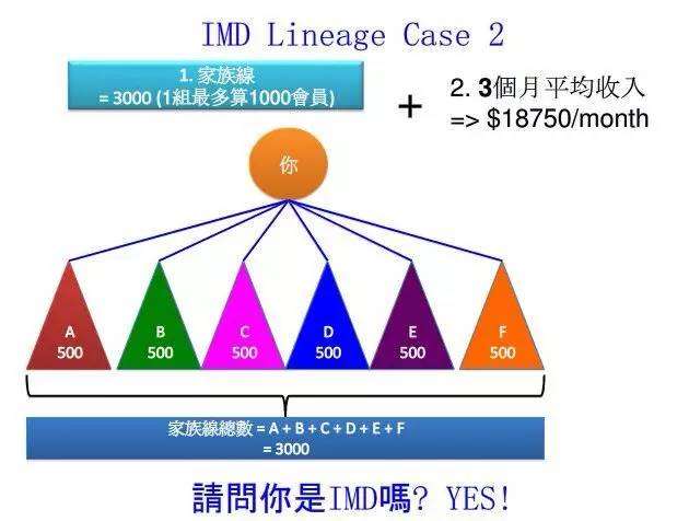 ★例图以黄金会员计算示意,铂金会员人数减半,至少保持3条以上家族线活跃成长才能晋级到IMD,即铂金会员500+500+500的格局。