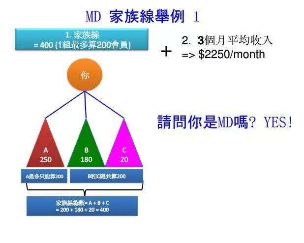 ★从MD开始,所有的人数都是按照直系家族线人来算的(自己直接推荐会员或者直推延伸下来的下级都属于直系家族线)