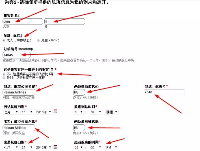 下面是订单上第二人的航班信息:这里可以选择两个人不在同一航班和在同一航班。不在同一航班的就还需要再填写另一个航班的信息!
