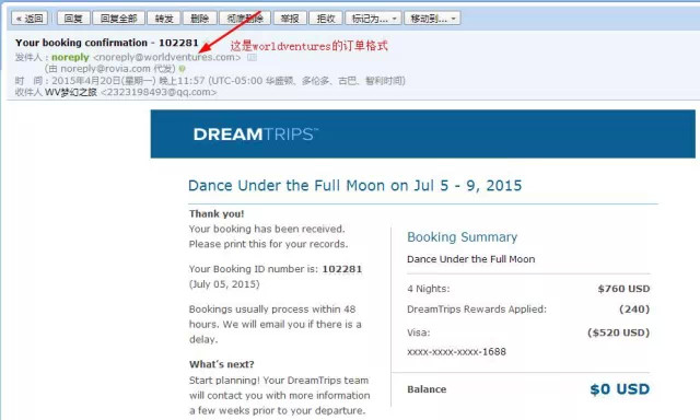 以下是订购套餐过后公司电邮的格式,两个套餐有点不一样,一个是rovia发出来的,一个是worldventures发的