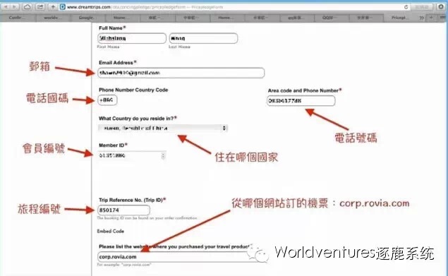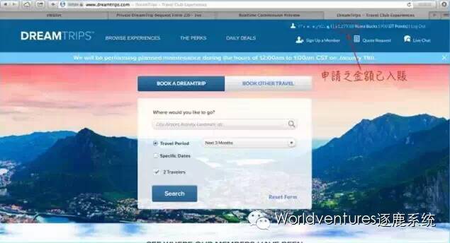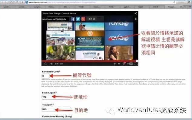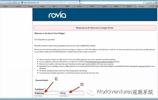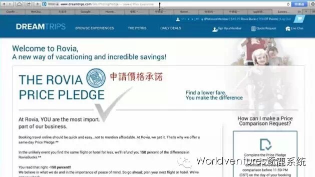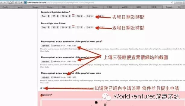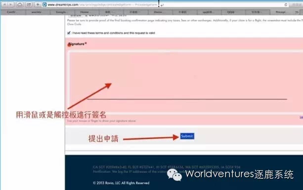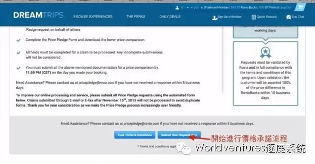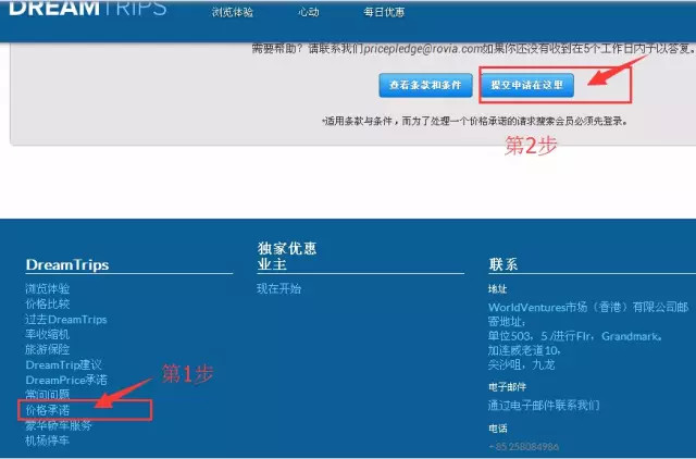 ▼准备好以上资料,登陆Dreamtrips网站,第一步点击首页左下角:价格承诺;打开页面后进行第2步,点击提交申请。