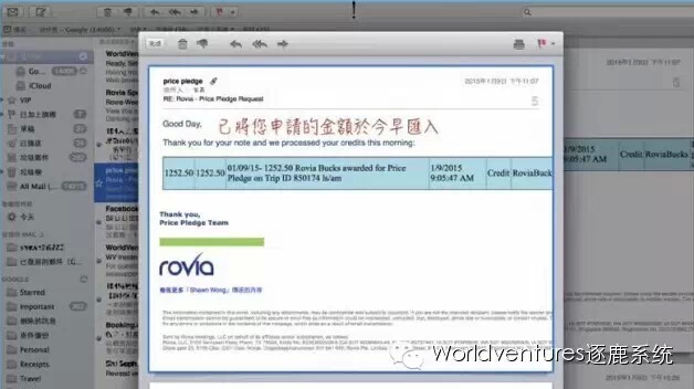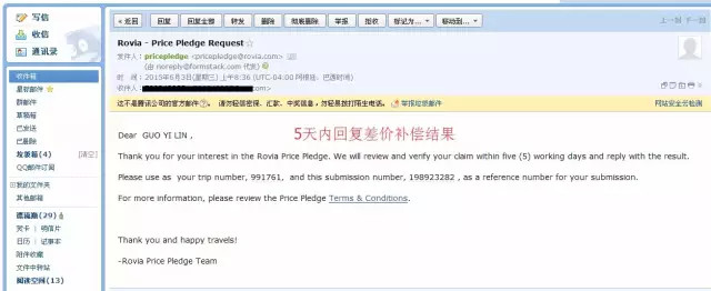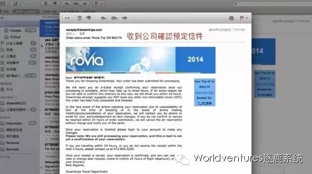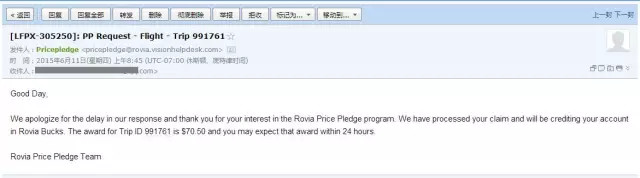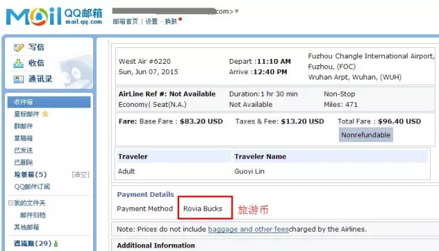 ▼很快收到公司发来的订单邮件,上面显示了具体的航班信息,并且表明付款方式为:Rovia Bucks,也就是我们习惯说的旅游币。