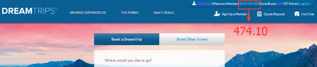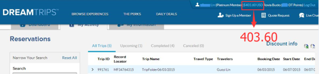 ▼查看个人账户,这是原有500美元的旅游币购买机票支付96.4美元后,余额为403.60美元。