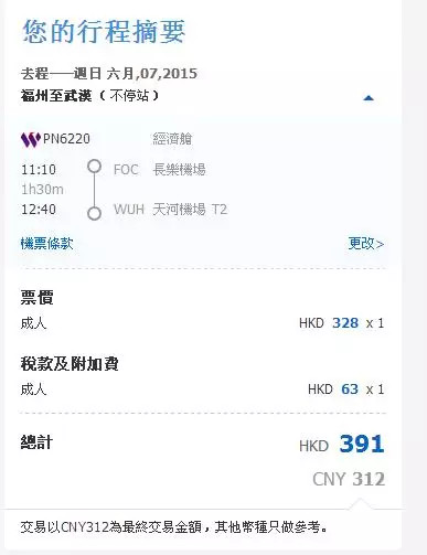 ▼订购的是福建省福州市飞往湖北省武汉市的航班,属于海南航空公司旗下的西部航空。