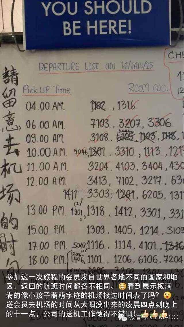 四天的旅行结束前,管家会在黑板上写上每个会员的接机时间,因为会员是来自世界各地的,航班不同,服务太周到了··赞!