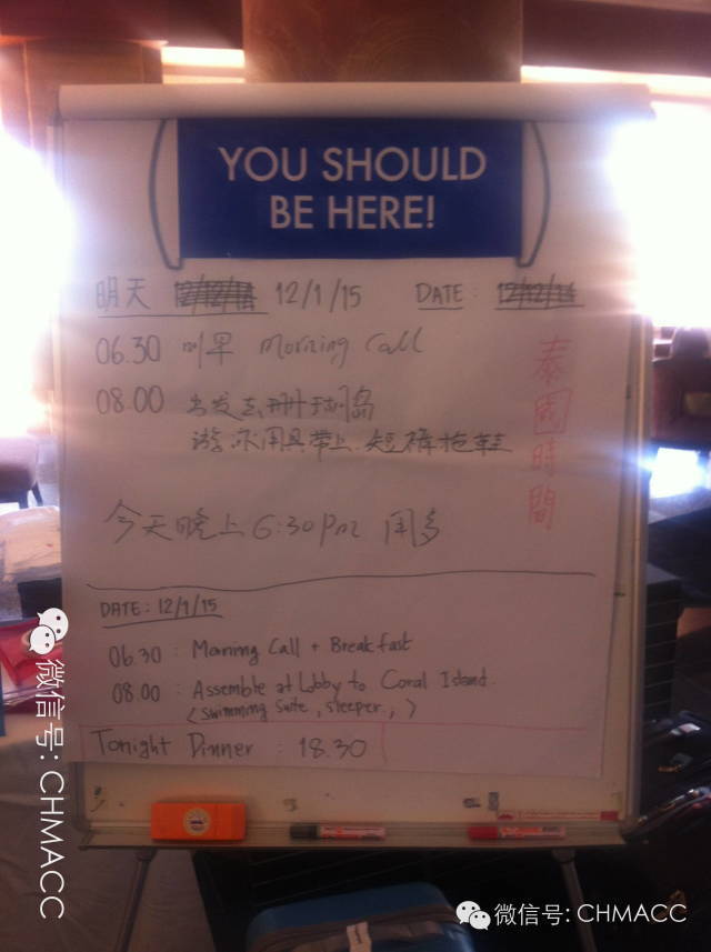 登记处都会有块黑板,中英文写着第二天的行程。由于第二天的这个珊瑚岛离我们酒店有点远,所以要8点就出发了。