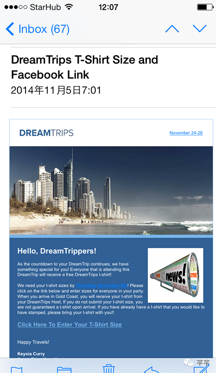 过了几天又收到公司的邮件,需要大家登记自己衣服的尺寸。因为梦幻之旅为大家准备了dream tripper T恤留作纪念。这个T恤还可以盖章纪念哦,好棒的想法!